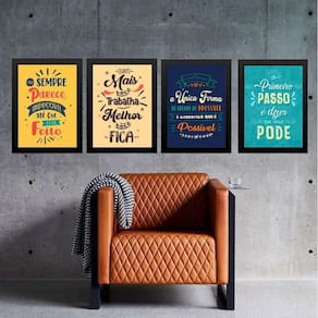 Kit 4 quadros frases motivacionais impacto trabalho 24x18cm - com vidro Moldura: madeira preta Informações do produto tire todas as suas dúvidas no descritivo abaixo: decoração para quarto, sala, cozinha, escritório, área gourmet e muito mais. Chega de paredes vazias medidas - cada peça tem 24x18cm a5 . Material do papel - papel fotográfico brilhante de altíssima resolução acabamento - todos os quadros são acompanhados de vidro para proteção da imagem. - moldura em madeira maciça na cor preta ou branca conforme produto escolhido e pendurador . - os quadros são embalados de forma segura com plástico bolha com camada dupla de acordo com o tamanho dos quadros. Garantia - garantia de 3 meses. Meu quadro chegou. Como posso fixá-lo Você precisa apenas de um martelo e um prego, pois os quadros já vão acompanhados de penduradores. Esta é a forma mais indicada. Como posso limpar meu quadro A limpeza é feita como um móvel comum da sua casa. Apenas um pano seco ou espanador são suficientes para tal