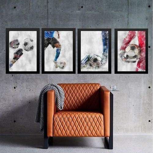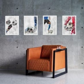 Kit 4 quadros futebol aquarela 33x24cm Moldura: madeira branca Informações do produto tire todas as suas dúvidas no descritivo abaixo: decoração para quarto, sala, cozinha, escritório, área gourmet e muito mais. Chega de paredes vazias medidas - cada peça tem 33x24cm a4 . Material do papel - papel fotográfico brilhante de altíssima resolução acabamento - todos os quadros são acompanhados de uma película de acetato para proteção da imagem. - os quadros são embalados de forma segura com plástico bolha com camada dupla de acordo com o tamanho dos quadros. Garantia - garantia de 3 meses. Meu quadro chegou. Como posso fixá-lo Você precisa apenas de um martelo e um prego, pois os quadros já vão acompanhados de penduradores. Esta é a forma mais indicada. Caso prefira, você pode utilizar uma fita dupla face neste caso, sugerimos de alta qualidade para evitar que descole e seu quadro caia . Como posso limpar meu quadro A limpeza é feita como um móvel comum da sua casa. Apenas um pano seco ou espanador são suficientes para tal
