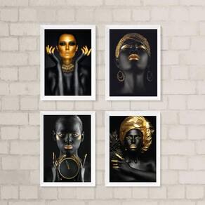 Leve mais beleza e sofisticação para a decoração da sua casa com o Kit 4 Quadros Mulheres Preto Com Dourado.