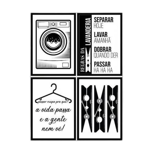 Kit 4 quadros para lavanderia 33x24cm - com vidro Moldura: madeira preta Informações do produto tire todas as suas dúvidas no descritivo abaixo: decoração para quarto, sala, cozinha, escritório, área gourmet e muito mais. Chega de paredes vazias medidas - cada peça tem 33x24cm a4 . Material do papel - papel fotográfico brilhante de altíssima resolução acabamento - todos os quadros são acompanhados de vidro para proteção da imagem. - moldura em madeira maciça na cor preta e pendurador . - os quadros são embalados de forma segura com plástico bolha com camada dupla de acordo com o tamanho dos quadros. - de 3 meses. Meu quadro chegou. Como posso fixá-lo Você precisa apenas de um martelo e um prego, pois os quadros já vão acompanhados de penduradores. Esta é a forma mais indicada. Como posso limpar meu quadro A limpeza é feita como um móvel comum da sua casa. Apenas um pano seco ou espanador são suficientes para tal Marca: Não Informado Ean: 7895142252089