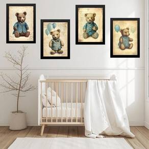 Kit 4 quadros quarto bebê ursos vintage 24x18cm Cor: moldura preta Informações do produto tire todas as suas dúvidas no descritivo abaixo: decoração para quarto, sala, cozinha, escritório, área gourmet e muito mais. Chega de paredes vazias medidas - cada peça tem 24x18cm a5 . Material do papel - papel fotográfico brilhante de altíssima resolução acabamento - todos os quadros são acompanhados de uma película de acetato para proteção da imagem. - os quadros são embalados de forma segura com plástico bolha com camada dupla de acordo com o tamanho dos quadros. Garantia - garantia de 3 meses. Meu quadro chegou. Como posso fixá-lo Você precisa apenas de um martelo e um prego, pois os quadros já vão acompanhados de penduradores. Esta é a forma mais indicada. Caso prefira, você pode utilizar uma fita dupla face neste caso, sugerimos de alta qualidade para evitar que descole e seu quadro caia . Como posso limpar meu quadro A limpeza é feita como um móvel comum da sua casa. Apenas um pano seco ou espanador são suficientes para tal