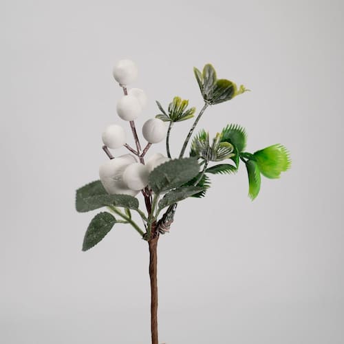 Cada fruta branca deste arranjo reflete o brilho e o calor da temporada, imitando a rica tonalidade e textura das frutas vermelhas frescas do inverno. Intercaladas com delicadas folhas verdes, estas frutas criam um contraste visual encantador, evocando memórias de ceias natalinas e momentos ao redor da lareira.