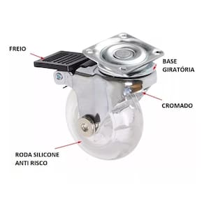 - Material da Base: Aço - Material da Roda: Silicone Gel Anti risco - Diâmetro: 50 mm 5 cm - Carga: 40 kg por roda - Altura total: 65 mm 6,5 cm - Largura da roda: 20 mm - Tamanho da Chapa: 42mm x 42 mm - Distancia entre furos: 32mm x 32 mm - Cor da Roda: Transparente - Cor da Base: Cromado