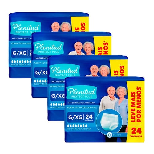 Roupa Íntima Plenitud Protect Plus G/XG - 24 unidades A Roupa Íntima Plenitud® Plus está melhor do que nunca! Já amada pelos nossos consumidores e líder de mercado no segmento, esse item é a escolha perfeita para quem busca proteção e conforto no dia a dia. Com uma cintura elástica com toque de algodão, a Roupa Íntima Plenitud® Plus proporciona um ajuste perfeito, garantindo máximo conforto durante o uso. Diferente de uma fralda geriátrica, a linha de Roupa íntima Plenitud®, é fácil de vestir e tirar, além de trazer uma tecnologia antivazamento e com controle de odores. Sinta-se seguro e confortável o dia todo com a Roupa Íntima Plenitud® Plus, o aliado perfeito para o seu dia a dia! Ean: 7896007550005