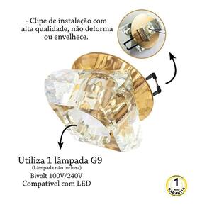 --comprimento: 6,9 cm --largura: 6,9 cm --altura do spot: 4 cm --altura total do spot: 6 cm - dimensões da base dourada brilhante: --comprimento: 8 cm --largura: 8 cm - recorte no teto : 6 cm - quantidade de lâmpadas: 1 - bocal: g9 - potência máxima: 40w - tensão: bivolt; - garantia: 1 ano - lâmpadas compatíveis para esse spot: lâmpada g9 led 3w, 5w ou 7w.