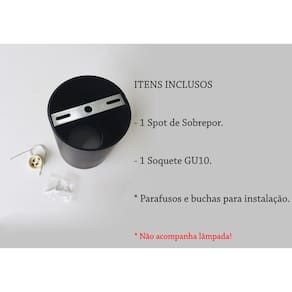 - 1 Spot de Sobrepor. - 1 Soquete GU10. Parafusos e buchas para instalação.