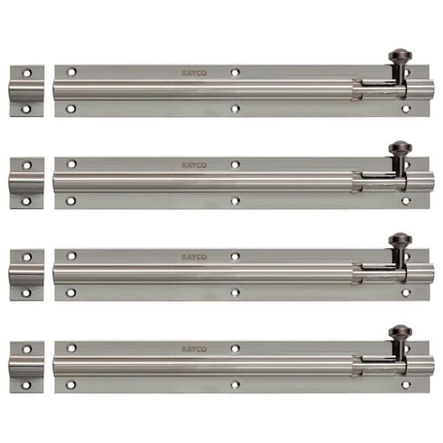 Kit com 4 Trincos 200mm Tarjeta Ferrolho para Porta Fio Redondo 8Pol. Em Alumínio Cromado Rayco O trinco reforçado para portas cromado da Rayco, além de trazer mais segurança, possui um design moderno, deixando sua casa mais sofisticada - Marca: Rayco - Referência: R13485 - Material: Alumínio - Acabamento: Cromado - Comprimento da base: 200mm 8 Polegadas - Largura da base: 31mm - Espessura da chapa: 1,8mm - Diâmetro do Pino: 8mm 5/16 Polegadas - Indicação de uso: portas, portões e janelas - Peso bruto: 165 gramas - : 90 dias Itens inclusos: - 1 Trinco / Tarjeta - 1 Engate - Parafusos para fixação Marca: Não Informado Ean: 7734625977357