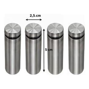 Altura: 5,0cm 50mm . Diâmetro: 2,5cm 25mm . Espessura compatível: vidro, madeira, acrílico e outros, de 10mm até 12mm. Recomendado furo de 12mm a 14mm no vidro, acrílico ou outros materiais. Parafuso de ajuste com 20mm para um encaixe preciso e seguro. Acompanha 2 arruelas plásticas transparentes para garantir um encaixe perfeito e proteger o material. Acabamento: polido