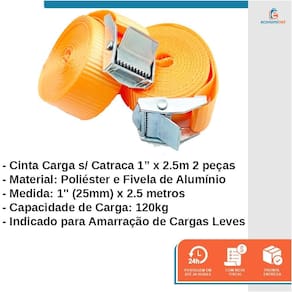 • Comprimento: 2,5 metros • Largura: 25mm • Material: Fibra Poliéster e Fivela Liga de Alumínio • Medida: 1'' x 2.5m • Capacidade de amarração: 120kg • Carga de ruptura: 250Kg • Indicado Para Amarração de Cargas Leves • Indicado para amarração de cargas em geral