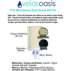 A vela oasis com carvão ativado são fabricadas com matéria-prima de primeira qualidade, queimadas em fornos elétricos a temperaturas elevadas, portanto não estão impregnadas com nenhum odor de combustíveis, madeiras e similares, sendo um produto de alta qualidade com todas as garantias de higiene, além de ser considerada uma das mais eficientes no tratamento da água.