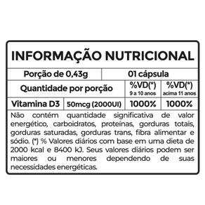 Ingredientes: Óleo de girassol, colecalciferol e antioxidante dl-alfa tocoferol. Composição da cápsula: gelatina, água purificada, umectante glicerina e corante natural cúrcuma. NÃO CONTÉM GLÚTEN.