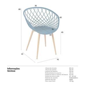 Cadeira Clarice com braços: Material do assento: Polipropileno - Material dos pés: Metal - Altura do encosto: 80 cm - Altura do assento: 45 cm - Largura do assento: 35 cm - Profundidade do assento: 43 cm - Distância entre os apoios de braços: 62 cm - Distância entre os pés: 41 cm - Peso suportado: 130 kg.