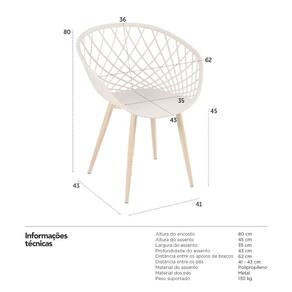 Cadeira Clarice com braços: Material do assento: Polipropileno - Material dos pés: Metal - Altura do encosto: 80 cm - Altura do assento: 45 cm - Largura do assento: 35 cm - Profundidade do assento: 43 cm - Distância entre os apoios de braços: 62 cm - Distância entre os pés: 41 cm - Peso suportado: 130 kg.