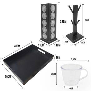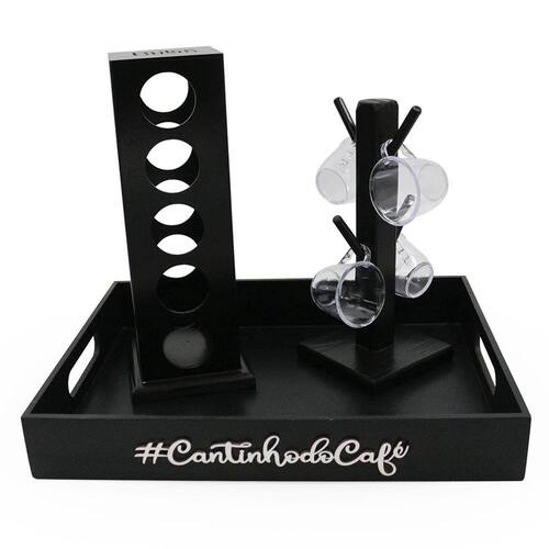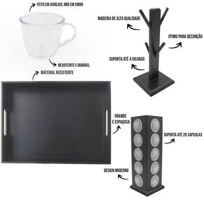 Kit 4 xicaras acrílico cristal porta capsulas para dolce gusto bandeja Composição do kit;4 xícaras1 bandeja1 suporte de xícaras1 porta capsulas para dolce gusto Xícara 85ml acrílica transparente As xícaras são muito bonitas e esse acrílico cristal traz um charme a mais ao produto, deixando-o mais decorativo para a hora do café. Você pode usar em casa ou no escritório, ter sempre à mão sua xícara para tomar aquele cafezinho, capuccino e até um chocolate quente se estiver com vontade. Capacidade 85mlMaterial - acrílicoAltura - 5,5 cmLargura - 8,5 cm Bandeja cantinho do café versátil e multiuso Feita em mdf de 6mm com pintura em tinta acrílica na cor preta ela é ideal para organizar o seu lar, servir um cafezinho para os amigos, organizar papeis de escritório entre diversas outras utilidades. Bandeja versátil de qualidade, combinando com todos os ambientes no qual estiver Suas medias são40x30x6 externa 38,5 x 28,5 x 5,5 na parte interna Possui as laterais vazadas como uma alça. Suporte porta xícara caneca em 4 pinos xicaras Esse é o produto ideal para decorar o seu tão especial cantinho do café ou até mesmo presentear uma pessoa querida, além da beleza o porta xicaras é feito em mdf que é muito resistente, ideal para xicaras/canecas de até 240ml. Com esse porta xicaras você vai conseguir deixar seus armários muito mais organizados. Medidas suporte:Altura: 24 cmBase: 11x11Peso: 282gMaterial de composição: madeira pinus Porta cápsula para cápsulas dolce gusto Esse porta cápsulas tem ar moderno feito em madeira mdf pintada com em preto, dando um ar de elegância para qualquer canto de sua casa. Organize seu canto do café com as casulas sempre a mão e ainda decore o seu ambiente com certeza vai ser uma peça que vai chamar a atenção e tirar elogios Feito em mdf com pintura preta tinta acrílica Comporta 20 capsulas dolce gustoMedidas 32x11x11 Cápsulas e máquina de café não inclusos Perguntas frequentes: - entregam para todo país Quem somos Marca: Dupétriz