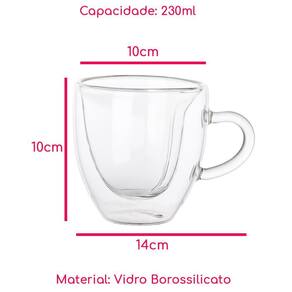 Características: Altura: 10cm Diâmetro: 10cm Comprimento com alça: 14cm Capacidade: 230ml Material: Vidro Borossilicato Marca: Class Home Conteúdo: 4 Xícaras