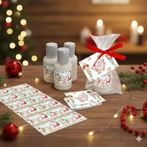 40 Frascos de Hidratante 30ml: Frascos transparentes, cheios de hidratante, com tampas também transparentes.40 Etiquetas Personalizadas: Cada frasco acompanha uma etiqueta temática de Natal, trazendo charme e personalização às lembranças.40 Tags com Furo: Tags decorativas de Natal, para adicionar um toque de personalização final.40 Fitas de Cetim: Fitas em cores natalinas para fechar os saquinhos de celofane com elegância.40 Saquinhos de Celofane Transparente: Embalagem prática e transparente, garantindo um acabamento sofisticado.Artes Disponíveis: Ao fazer sua compra, você poderá escolher entre uma das 6 opções de arte: