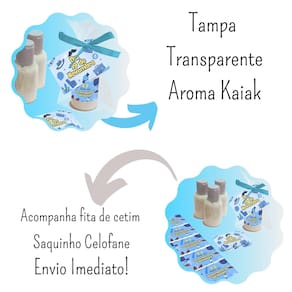 Frasco cristal de 30ml com hidratante perfumado aroma Kaiak Etiqueta personalizada com arte temática Tag com furo combinando Fita de cetim para o laço perfeito Saquinho de celofane transparente Tampa transparente para acabamento sofisticado