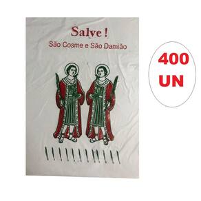 Contém: 400 unidades de sacos de plástico para São Cosme e Damião Tamanho aproximado: 18cm x 28cm Material: Plástico Desenho: estaremos enviando o modelo disponível em Ean: 7803760685752