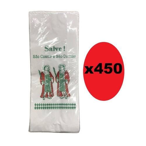 Contém: 450 unidades de sacolas de papel para São Cosme e DamiãoTamanho aproximado: 9cm x 27cmMaterial: PapelDesenho: estaremos enviando o modelo disponível em estoque