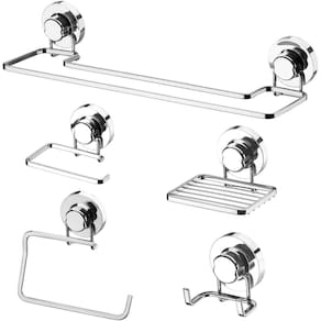 Fabricante: Schmitt Aramados Peso: 1 kg Cor: Cromado Conteúdos: 1 saboneteira, 2 toalheiros, 1 papeleira, 1 gancho. Material: aço cromado e abs Diâmetro das ventosas: 7cm