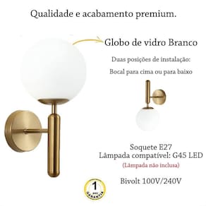 O lup58 é a arandela que combina com qualquer ambiente interno. A sua cor em dourado em conjunto com o seu globo branco, A destaca em beleza e sutileza. Podendo ser instalada com o globo para cima ou para baixo.