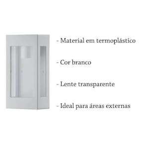 Arandela externa retro na cor branca, utiliza 1 lâmpada led E27, ideal para led filamento retro. Com design diferenciado em material termoplástico, ideal para ambientes externos como jardins, quintais, varandas e sacadas. -- Neste kit contém 5 arandelas -- Descrição: - Materiais: Termoplástico Estrutura - Cor: Branco - Lente: Transparente - Medidas Altura: 25 cm Comprimento: 12,5 cm Profundidade: 8 cm - Bivolt - Soquete: E27 - Exclusivo uso de lâmpada Led - Corrente: 4A - Potencia: 20w - Tensão: 127/220 - Resistente à maresia - Lâmpada não inclusa. - Duas posições de instalação - Ela pode ser Utilizado de bocal para cima ou para baixo. Ean: 7891072775070
