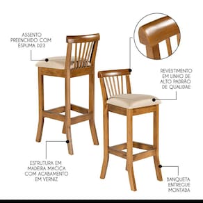 Kit de Banquetas Alta Valencia promete ser o centro das atenções em todos os ambientes. Com um design exclusivo e moderno, a banqueta é perfeita para bancada de cozinha américa, balcão alto, mesa bar, espaço gourmet, cantinho do churrasco e muito mais. O destaque fica por conta do encosto ergonômico, dando um toque único a banqueta. Produzida com madeira maciça, garantindo a sua durabilidade e vida útil. CARACTERÍSTICA TÉCNICAS: - Produzido em Madeira Maciça - Acabamento em Verniz na cor Imbuia - Assento Estofado Preenchido com Espuma D23 - Tecido de Alta Qualidade Linho Bege M58 - Banqueta Entregue Montado INFORMAÇÕES TÉCNICAS: - Altura Total: 100 cm - Altura até o Assento: 74 cm - Largura Total: 36 cm - Largura Assento: 35/40 cm - Profundidade Total: 46 cm - Profundidade Assento: 38 cm - Peso: 8 kg *Kit Composto por CINCO Banquetas Informações Adicionais: Garantia para defeitos de fabricação conforme Código de Defesa do Consumidor. *ATENÇÃO: Não nos responsabilizamos pela montagem, subir ou içar o móvel. *As imagens ambientadas são meramente ilustrativas e podem apresentar itens que não compõe o produto, as cores do produto podem variar de acordo com o monitor, a iluminação do ambiente ou sua percepção visual. *Limpeza: Deve ser feita com pano macio e seco ou levemente umedecido com água e sabão neutro. Não devem ser utilizados abrasivos.