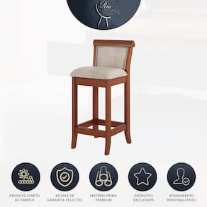 A Banqueta Média Mônaco promete ser o centro das atenções em todos os ambientes. Perfeita para bancada de cozinha américa, balcão, mesa bar, espaço gourmet, cantinho do churrasco e muito mais. Possui uma estrutura reforçada em madeira de taeda com acabamento em verniz que aumenta a sua durabilidade. Possui assento estofada com espuma D23 e tecido linho. O seu ambiente vai ficar muito mais elegante e cheio de charme com os móveis da Rio Madeira Interiores. Característica do Produto: - Produzida em Madeira Maciça Taeda - Assento Estofado Preenchido com Espuma D23 - Acabamento em Verniz cor Imbuia - Tecido de Alta Qualidade Linho Bege M58 - Produto Entregue Montado *Kit Composto por 5 Banquetas Dados Técnicos do Produto: - Altura Total: 90 cm - Altura do Encosto: 26 cm - Altura para Sentar: 65cm - Largura Total: 36 cm - Largura do Assento: 40/35 cm - Profundidade Total: 46 cm - Profundidade do Assento: 36 cm - Peso: 8 kg Embalagem do Produto: Altura Total: 100,5 cm Largura: 50 cm Profundidade: 40 cm Peso: 14 kg Cubagem: 0,205 m³ Informações Adicionais: Garantia para defeitos de fabricação conforme Código de Defesa do Consumidor. *ATENÇÃO: Entregas são feitas em horário comercial. Não nos responsabilizamos pela montagem, subir ou içar o móvel. **As imagens ambientadas são meramente ilustrativas e podem apresentar itens que não compõe o produto, as cores do produto podem variar de acordo com o monitor, a iluminação do ambiente ou sua percepção visual. ***Limpeza: Deve ser feita com pano macio e seco ou levemente umedecido com água e sabão neutro. Não devem ser utilizados abrasivos.