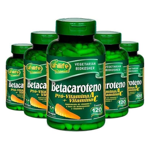 Betacaroteno da Unilife Vitamins é um suplemento em cápsulas à base de betacaroteno pró-vitamina A e vitamina C.
