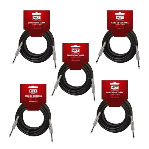 KIT 5 Cabo Guitarra P10/P10 5 Metros MXT O Cabo de Guitarra MXT P10/P10 – 5 Metros é a escolha ideal para músicos que buscam confiabilidade e qualidade sonora em suas performances. Com construção robusta, sua estrutura flexível em PVC oferece resistência ao desgaste e manuseio constante. Os conectores P10 mono metálicos garantem contato firme e redução de ruídos, tornando este cabo compatível com guitarras, baixos, violões, teclados, pedais, amplificadores e mesas de som. Perfeito tanto para ambientes de estúdio quanto apresentações ao vivo.