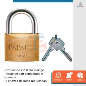 Os cadeados Papaiz são sinônimos de proteção e referência mundial de qualidade. Produzidos com matérias-primas de primeiríssima qualidade garante grande resistência e durabilidade, mesmo em ambientes úmidos. Seu corpo feito em latão maciço, possui haste reforçada (cementada e temperada) e acabamento cromado que aumenta a resistência ao corte.