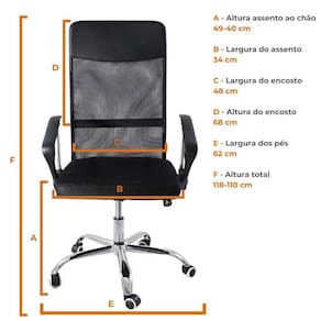Altura total: 110 a 118 cm Altura do assento ao chão: 40,5 a 49,5 cm Altura do braço ao chão: 63 a 68 cm Altura do encosto: 68 cm Altura do braço: 23 cm