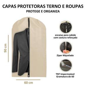 Capa protetora com zíper e material resistente, perfeita para proteger e conservar suas roupas. Mantenha suas roupas sempre protegidas.- Com este nosso produto, você evita a umidade que produz o mofo e ao mesmo tempo protege suas roupas da poeira.- Guarda roupas ou closet mais organizados, sem que as roupas enrosquem entre si e evitando futuros problemas.- Material em TNT com Gramatura de 60.- Dimensões: 60 cm de largura x 90 cm de altura.- Cor: Bege Clean. Especificações Capa toda em TNT:- Confeccionado em TNT, Zíper de Nylon e Cursor Niquelado.- Possui Zíper em toda a altura facilitando a colocação dentro da capa.- Dimensões: 60cm de Largura x 90cm de Altura.- Tecido impermeável protege da umidade, bolor e bactérias.Conteúdo: 5 Capa Protetora com Ziper