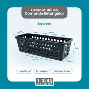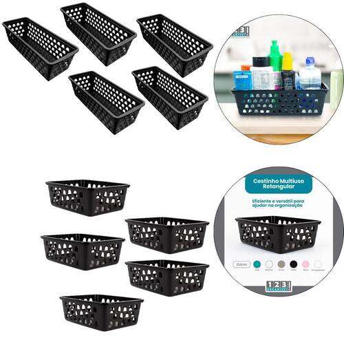 Kit 5 Cesto Multiuso Comprido Retangular e 5 Cesto médio Cesto Multiuso Comprido Retangular Preto 123 Organizei Os Cestos Multiuso 123Organizei, são muito charmosos e discretos. Podem ser em armários, gavetas, guarda roupas e até mesmo em banheiro. MEDIDAS: Altura: 8,00cm Largura: 11,00cm Comprimento: 28,00cm 123organizei ------------------------------------------------------------ CESTO PRETO Médio 123ORGANIZEI Cor PRETO Medidas 20x15,5x6,5Cm Material PLástico Marca 123Organizei Marca: Não Informado