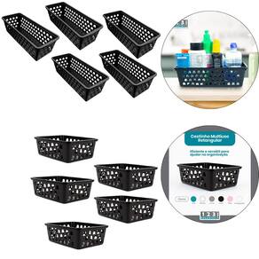 Kit 5 Cesto Multiuso Comprido Retangular e 5 Cesto médio Cesto Multiuso Comprido Retangular Preto 123 Organizei Os Cestos Multiuso 123Organizei, são muito charmosos e discretos. Podem ser em armários, gavetas, guarda roupas e até mesmo em banheiro. MEDIDAS: Altura: 8,00cm Largura: 11,00cm Comprimento: 28,00cm 123organizei ------------------------------------------------------------ CESTO PRETO Médio 123ORGANIZEI Cor PRETO Medidas 20x15,5x6,5Cm Material PLástico Marca 123Organizei
