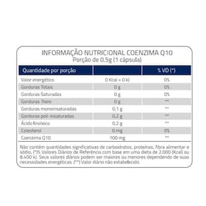 Ingredientes: Óleo de Soja (Glycine max), Coenzima Q10; Cápsula: Gelatina, Água Purificada, Umectante (INS 422) e Corantes (INS 150a e INS171). ALÉRGICOS: CONTÉM DERIVADOS DE SOJA. NÃO CONTÉM GLÚTEN.