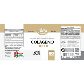 Ingredientes Colágeno de frango com colágeno tipo II, colecalciferol, agente de massa: celulose microcristalina, antiumectantes: dióxido de silício e estearato de magnésio. Cápsula: gelatina bovina e água. Marca: Não Informado