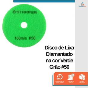 Disco de lixa diamantado para polimento, abrasivo em resina branca, com pluma na parte traseira. Indicado para lixar e polir mármore e porcelanato.Para uso em disco de borracha 100mm - StarferEspecificações técnicas:Diâmetro do disco: 100mm.Diâmetro do furo: 16mm.Rotação máxima: 4800rpm.Uso: Furadeira e Esmerilhadeira.Quantidade: 5 unidades.Grão: Cor Verde Claro #50.Fixa Fácil: SimRef.: 4003901Marca: Starfer