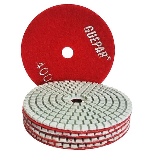 Jogo com 5 Discos Diamantados Flexível Brilho dÁgua 100mm Polimento Lixa Grão 400 Guepar - Marca: Guepar - Referência: 861-03296 - Diâmetro: 100mm - Furo: 22,2mm - Espessura: 4mm - É indicado para uso em esmerilhadeira angular para acabamento/ polimento de mármore, granito e pedras naturais. - Necessita de suporte para fixação com base aderente não acompanha - : 90 dias