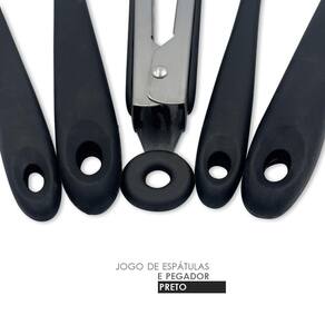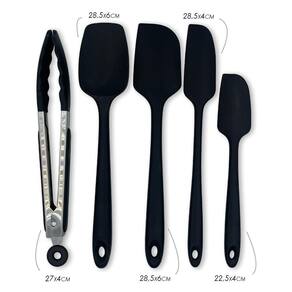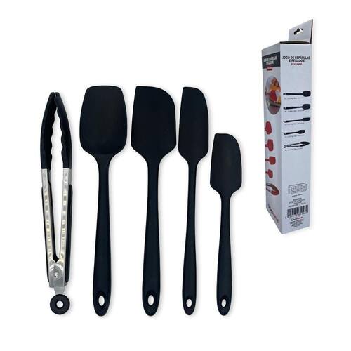 1 kit com 5 utensílios de silicone, sendo 4 espátulas e 1 pegador, na cor preto ou vermelho cor enviada conforme disponibilidade