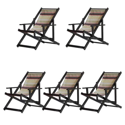 Kit 5 Espreguiçadeiras Dobrável Black Cb-chevron Vermelho 5 ESPREGUIÇADEIRAS ENVERNIZADAS BLACK C/BSabe aquele final de tarde que você tanto espera para tirar um descanso merecido? Ou aquela viagem para a praia programada a meses com a família? Pois é, nossas cadeiras espreguiçadeira serve exatamente para esses momentos, com várias opções de cores, os tecidos além de charmosos são hidro-repelentes e se adequam a qualquer ambiente, facilmente removíveis para higienização.Estrutura 100% de madeira maciça e verniz especial, que garante sua qualidade e durabilidade, a espreguiçadeira é totalmente dobrável e reclinável (4 posições de ângulo), com descanso para braço, sendo possível montar invertida sem o encosto de braço, perfeita para seu lazer em todos os ambientes, seja ele externo ou interno, esse é o item que definitivamente não pode faltar na vida de quem de fato, quer aproveitar bons momentos! FICHA TÉCNICA DO PRODUTO:04 Níveis de Regulagem de Altura;Tecido Reforçado;Fabricada em Madeira Maciça Pinus;Peso aproximado: 7,5 Kg;Suporta aproximadamente 120 kg;Cor da Madeira: Preta Dimensões aproximadas do Produto:Altura 1: 69 cm;Altura 2: 82 cm;Altura 3: 91 cm;Altura 4: 100 cm;Profundidade: 105 cm. Dimensão aproximada total:Comprimento: 135 cm;Largura: 66 cm; Informações Adicionais:Garantia: 90 dias contra defeitos de fabricação.Acompanha 5 cadeiras Obs. A cor pode variar da foto conforme a tonalidade da madeira e iluminação.. !! Marca: Brasil Móveis