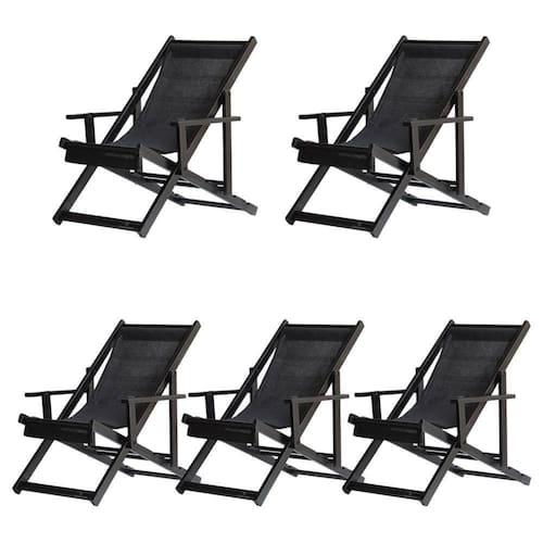 Kit 5 Espreguiçadeiras Dobrável Black Cb-preto 5 ESPREGUIÇADEIRAS ENVERNIZADAS BLACK C/BSabe aquele final de tarde que você tanto espera para tirar um descanso merecido? Ou aquela viagem para a praia programada a meses com a família? Pois é, nossas cadeiras espreguiçadeira serve exatamente para esses momentos, com várias opções de cores, os tecidos além de charmosos são hidro-repelentes e se adequam a qualquer ambiente, facilmente removíveis para higienização.Estrutura 100% de madeira maciça e verniz especial, que garante sua qualidade e durabilidade, a espreguiçadeira é totalmente dobrável e reclinável (4 posições de ângulo), com descanso para braço, sendo possível montar invertida sem o encosto de braço, perfeita para seu lazer em todos os ambientes, seja ele externo ou interno, esse é o item que definitivamente não pode faltar na vida de quem de fato, quer aproveitar bons momentos! FICHA TÉCNICA DO PRODUTO:04 Níveis de Regulagem de Altura;Tecido Reforçado;Fabricada em Madeira Maciça Pinus;Peso aproximado: 7,5 Kg;Suporta aproximadamente 120 kg;Cor da Madeira: Preta Dimensões aproximadas do Produto:Altura 1: 69 cm;Altura 2: 82 cm;Altura 3: 91 cm;Altura 4: 100 cm;Profundidade: 105 cm. Dimensão aproximada total:Comprimento: 135 cm;Largura: 66 cm; Informações Adicionais:Garantia: 90 dias contra defeitos de fabricação.Acompanha 5 cadeiras Obs. A cor pode variar da foto conforme a tonalidade da madeira e iluminação.. !! Marca: Brasil Móveis