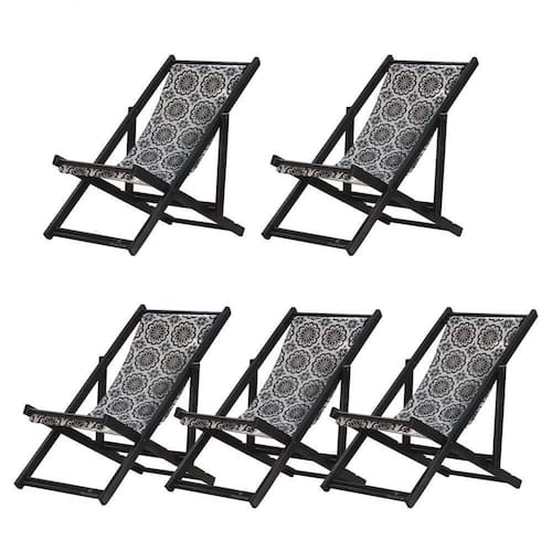 Kit 5 Espreguiçadeiras Dobrável Black Sb-mandala 5 ESPREGUIÇADEIRAS ENVERNIZADAS BLACK S/BSabe aquele final de tarde que você tanto espera para tirar um descanso merecido? Ou aquela viagem para a praia programada a meses com a família? Pois é, nossas cadeiras espreguiçadeira serve exatamente para esses momentos, com várias opções de cores, os tecidos além de charmosos são hidro-repelentes e se adequam a qualquer ambiente, facilmente removíveis para higienização.Estrutura 100% de madeira maciça e verniz especial, que garante sua qualidade e durabilidade, a espreguiçadeira é totalmente dobrável e reclinável (4 posições de ângulo), perfeita para seu lazer em todos os ambientes, seja ele externo ou interno, esse é o item que definitivamente não pode faltar na vida de quem de fato, quer aproveitar bons momentos! FICHA TÉCNICA DO PRODUTO:04 Níveis de Regulagem de Altura;Tecido Reforçado;Fabricada em Madeira Maciça Pinus;Peso aproximado: 7,5 Kg;Suporta aproximadamente 120 kg;Cor da Madeira: PretaAcabamento: Envernizada Dimensões aproximadas do Produto:Altura 1: 69 cm;Altura 2: 82 cm;Altura 3: 91 cm;Altura 4: 100 cm;Profundidade: 105 cm. Dimensão aproximada total:Comprimento: 135 cm;Largura: 60 cm; Informações Adicionais:Garantia: 90 dias contra defeitos de fabricação.Acompanha 5 cadeiras Obs. A cor pode variar da foto conforme a tonalidade da madeira e iluminação..