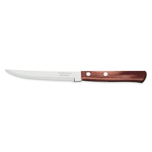 Rebites de alumínio. Pode ir à máquina de lavar louças facilitando seu dia a dia. Seu fio possui grande durabilidade e resistência por ser produzido em aço inox e receber tratamento térmico e pelo seu cabo ser em madeira tratada Polywood, a peça combina com ambientes rústicos e oferece todo o charme que seu churrasco merece. Medidas aproximadas do produto - Comprimento: 21,1 cm - Altura: 0,9 cm - Largura: 1,9 cm - Peso: 31,5 g