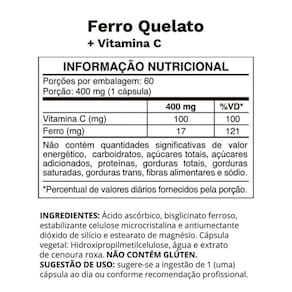 Kit 5 Ferro Quelato + Vitamina C Ocean Drop 60 Cápsulas O ferro desempenha múltiplas funções vitais, incluindo o transporte de oxigênio pela hemoglobina, essencial para o metabolismo celular. Além disso, está presente em enzimas e complexos moleculares que desempenham papéis cruciais no metabolismo energético e na síntese de DNA. Composição: - Ácido ascórbico vitamina C - Bisglicinato ferroso - Estabilizante: celulose microcristalina - Antiumectante: dióxido de silício e estearato de magnésio - Cápsula vegetal: Hidroxipropilmetilcelulose, água e extrato de cenoura roxa - NÃO CONTÉM GLÚTEN. Indicação: - Imunidade - Metabolismo - Anemia ferropriva anemia por deficiência de ferro Modo de consumo: - Sugere-se a ingestão de 1 cápsula ao dia ou conforme recomendação . Contraindicação: - Este produto é indicado para o grupo populacional maior de 19 anos. - Não deve ser consumido por gestantes, lactantes e crianças. Marca: Não Informado
