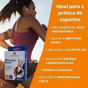 Kit 5 fita dilatador nasal tamanho m 10 unidades Kit 5 fita dilatador nasal tamanho m 10 unidades O que é fita dilatador nasal Fita nasal adesiva discreta, em dois tamanhos, destinada a dilatar o nariz para melhorar a respiração em caso de esporte, ronco, congestão nasal... de forma não medicamentosa. Indicações - abre as vias nasais facilitando e otimizando a respiração; - ideal para prática de esportes; - reduz o ronco e melhora o sono - combate a congestão nasal Vantagens - cor discreta - não medicamentoso Modo de uso: Uso externo - a pele deve estar limpa e seca para uma melhor aderência, cosméticos e outros produtos tópicos podendo interferir na aderência do produto sobre a pele. - após limpar e secar a área externa do nariz, colocar a fita dilatador nasal em cima do nariz, de modo que fique logo abaixo do osso e acima das narinas. Princípios ativos: N/a Modo de ação: - a fita dilatador nasal abre as vias nasais de forma mecânica, proporcionando maior fluxo de ar e melhor respiração. - ela ajuda em caso de desvio do septo. - a fita dilatador nasal facilita e otimiza a respiração nasal, é ideal para quem pratica exercício físico pesado ou até uma simples caminhada. - Utilizado durante a noite a fita dilatador nasal diminui a congestão nasal noturna e os roncos melhorando o bem-estar. - não contém podendo ser junto a qualquer tratamento medicamentoso. Apresentações: Disponível em embalagens com 10 e 30 unidades nos tamanhos médio e grande. Tamanho médio: 6616 mm Tamanho grande: 5516 mm Informações bibliograficas sobre os princípios ativos: As fitas adesivas dilatador nasal são um dispositivo projetado para ajudar a melhorar a respiração nasal. Elas são colocadas na ponta do nariz e exercem uma leve pressão para expandir os orifícios nasais, o que pode ajudar a aliviar a congestão nasal e a dificuldade de respirar. Uma revisão sistemática de 2017, publicada no international forum of allergy & rhinology, encontrou evidências de que as fitas adesivas dilatador nasal podem ser eficazes no alívio da congestão nasal e da dificuldade de respirar em indivíduos com rinite alérgica sazonal. Outro estudo, publicado no journal of asthma and allergy education, também encontrou que as fitas adesivas dilatador nasal podem ser eficazes no alívio da congestão nasal em indivíduos com rinite não alérgica. Além disso, as fitas adesivas dilatador nasal são seguras e fáceis de usar. Elas não possuem efeitos colaterais significativos e são uma opção de tratamento sem receita médica para a congestão nasal. Em resumo, as fitas adesivas dilatador nasal podem ser uma opção eficaz e segura para o alívio da congestão nasal e da dificuldade de respirar em indivíduos com rinite alérgica sazonal e não alérgica. Fontes: kim, h., cho, s., & kim, j. 2017 . efficacy of nasal dilator strips for seasonal allergic rhinitis: a systematic review. International forum of allergy & rhinology, 7 3 , 241-247. han, j. H., kim, j. H., & kim, j. H. 2015 . Nasal dilator strips for nasal congestion relief in nonallergic rhinitis: a randomized, placebo-controlled trial. journal of asthma and allergy education, 6 2 , 115-121. Composição: Polietileno microperfurado e adesivo acrílico hipoalergênico Contraindicações e precauções de uso Não é indicado para crianças menores de 5 anos. Não utilizar sobre a pele lesionada ou irritada Pessoas com alguma doença respiratória, deve consultar o médico antes de usar o produto. Em caso de irritação, suspenda o uso e procure orientação médica. Descarte após o uso. Conservação: Temperatura ambiente Anvisa: Produto não regularizado pela anvisa como dispositivo médico.