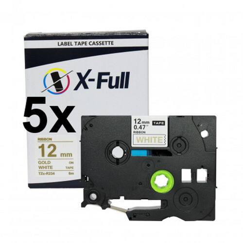 Kit 5 Fitas Cetim Compatível Brother Tze R234 Fita Branca Letra Dourada 12mm