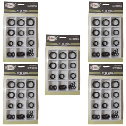 Quantidade de kits: 5 embalagens com 50 anéis cada Material: Borracha Quantidade total de Anéis: 50 peças de diversos tamanhos