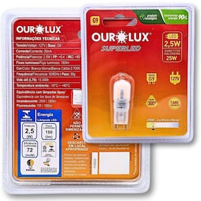 - Base: G9 - Potência: 2,5W - Voltagem: 127V - Fluxo Luminoso: 180 lm - frequência: 50/60Hz - Temperatura de Cor: 2700K branco quente , proporcionando uma iluminação energizante e clara. - Ângulo de Abertura: 300, garantindo uma distribuição ampla da luz em todo o ambiente. - Acabamento Fosco: O design fosco ajuda a suavizar a luz, evitando ofuscamentos e criando um ambiente mais confortável. - Econômica e Ecológica 90% da energia: Com tecnologia LED, essa lâmpada consome menos energia e possui uma vida útil prolongada. - Validade: Indeterminada. - Tamanho do Produto: 4,5cm altura x 1,5cm largura. - Composição do Produto: Contém polímero termoplástico, metal e componentes eletrônicos. Marca: Não Informado