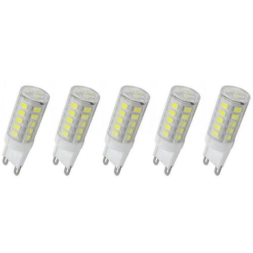 Alimentação: 110/220V Tipo de soquete: G9 Peso Aprox. com embalagem: 0,90kg Dimensões aprox. do produto 16x60mm Tipo de LED: SMD 2835 Angulo de Abertura: 360º Lúmens: 400/350Lm Material: Policarbonato Tonalidade: Branco 3000k